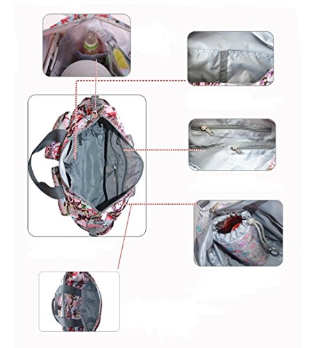 Spacious interior with multiple organizational compartments,6 interior pockets: 2 zipper pockets and 1 mesh pocket for personal belongings,3 open pockets for for nappy or baby clothes.