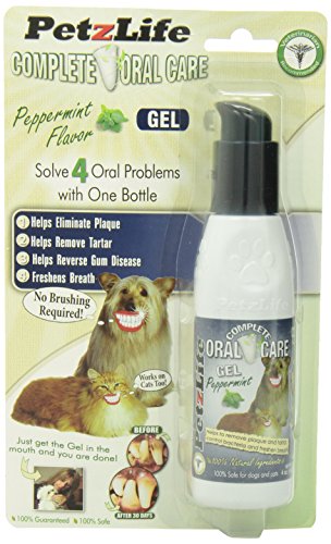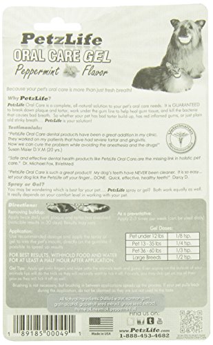 Our peppermint flavored gel removes plaque and tartar from your pet's teeth--no toothbrush required! Made with all-natural, holistic ingredients, Oral Care Gel safely removes plaque and tartar, reverses oral disease, promotes healthy gums, brightens teeth and kills the bacteria that causes bad breath. The ingredients mix with your pet's saliva when applied on your pet's teeth and completely coats your pet's teeth and mouth. This process kills harmful bacteria and loosens plaque and tarter. Safe for cats and dogs of all breeds. Start your pet on the road to better oral health today. PetzLife guarantees a 100% refund of your purchase price if you are not satisfied and when you return the unused portion.Feature