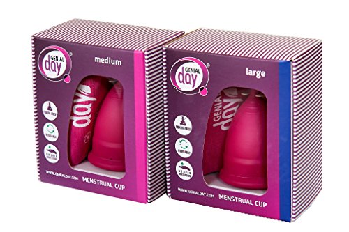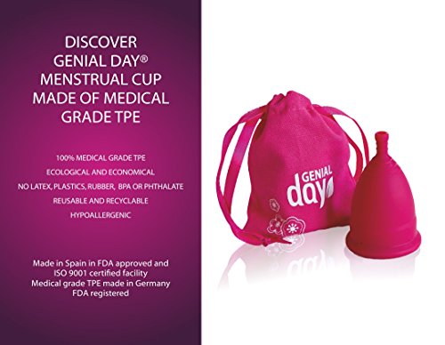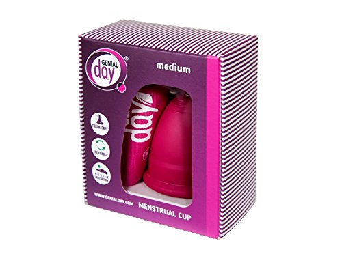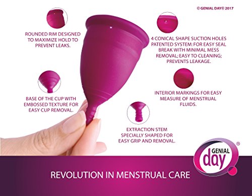 Studio : Genial Day Publisher : Genial Day Binding : Health and Beauty Product Description The menstrual cup is a natural alternative to tampons and pads. Its function is to collect the flow of your period. Medium: It`s for women under 25 years old, who have not given birth vaginally, with moderate flow. Capacity 25ml/oz0.845 Rounded rim designed to maximize hold to prevent leaks: 4 Conical shape suction holes Patented System: for easy seal break, with minimal mess removal; easy to cleaning prevents leakage; Extraction stem specially shaped for easy grip and removal 0