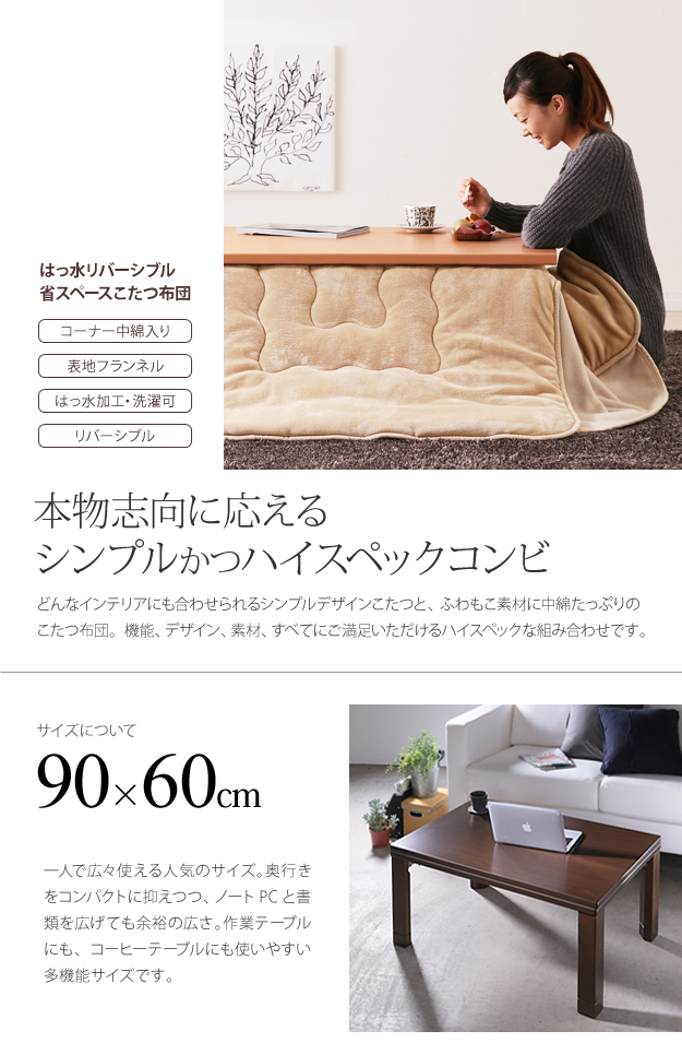 ●サイズ:こたつ-幅90x奥行60x高さ40cm(35+継ぎ脚5cm)・約15.5kg、布団-200x170cm・中綿量約730g