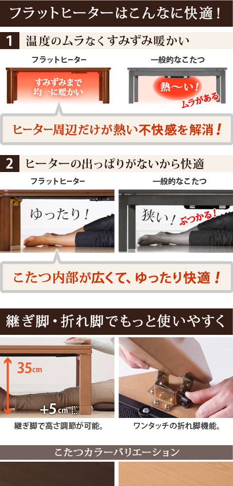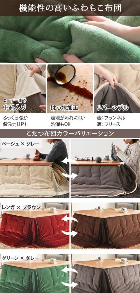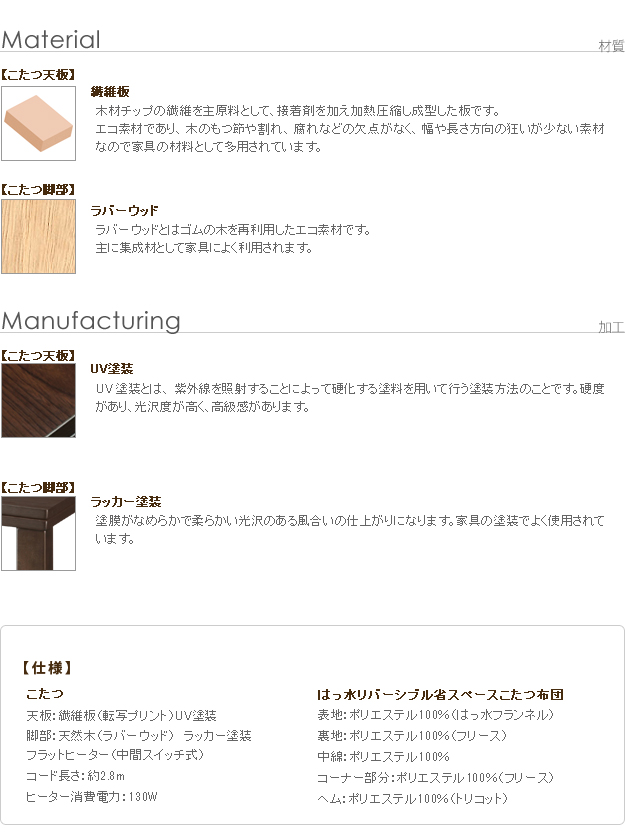 ●材質:こたつ天板-繊維板・UV塗装(オーク柄木目転写)、こたつ脚部-天然木(ラバーウッド)、布団表地-ポリエステル100%(撥水フランネル)、布団裏地-ポリエステル100%(フリース)、中綿-ポリエステル100%