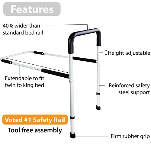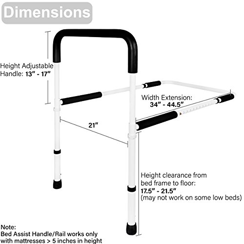 If getting in and out of bed presents a challenge, the solution is simple. The Medical Home Bed Assist Handle/Rail provides a safe and secure grip to help seniors, disabled, or anyone with physical limitations or injuries to get in and out of bed unassisted. Equipped with a slip resistant handle, foam padding, horizontal stabilizer bars and floor standing legs, this unit provides the ultimate support and stability for its users. The bed rail can be placed on either side of the bed for maximum convenience. It will fit all sizes of bed (Twin, Full, Queen, King). It is constructed of heavy-duty powder-coated steel, making it strong and can hold up to 300lbs. Our bed rails will arrive in 3-pieces and are easy to assemble and install with no tools required. This modern handrail design will blend in nicely in any of your bedroom. It promotes mobility independence and the prevention of bedside falls; a common problem among seniors and patients. (Note: Bed Assist Handle/Rail works best with mattresses > 5 inches in height. This may not work on some low beds - check to ensure height from floor to bottom of mattress to be at least 17.5") 0 |