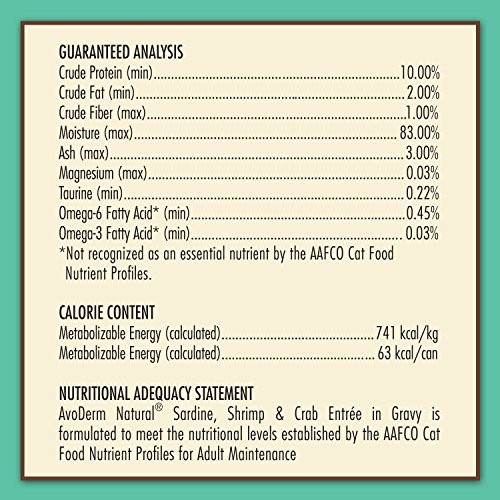 AvoDerm Natural Sardine, Shrimp and Crab Entree in GravyAvoDerm Natural Sardine, Shrimp and Crab Entree in Gravy is made with sardine, fish broth, shrimp and crab, which are mixed together in a healthy and tasty gravy. This special dish is made for protein sensitive cats that need optimum nutrition for good health.