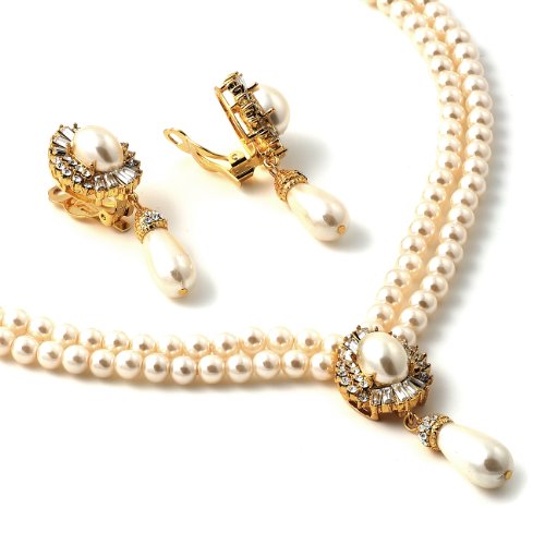 -. Title : Gold 2 Line Cream Strand with Cream Pearl Centerpiece Necklace & Dangle Clip Earrings Jewelry Set