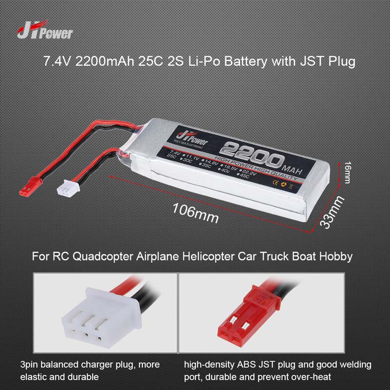 This high quality 7.4V 2200mAh 25C 2S liPo battery is just designed for RC super fans. It's suitable for RC drone airplane car truck hobby. Good choice for you to enjoy more flying joys.