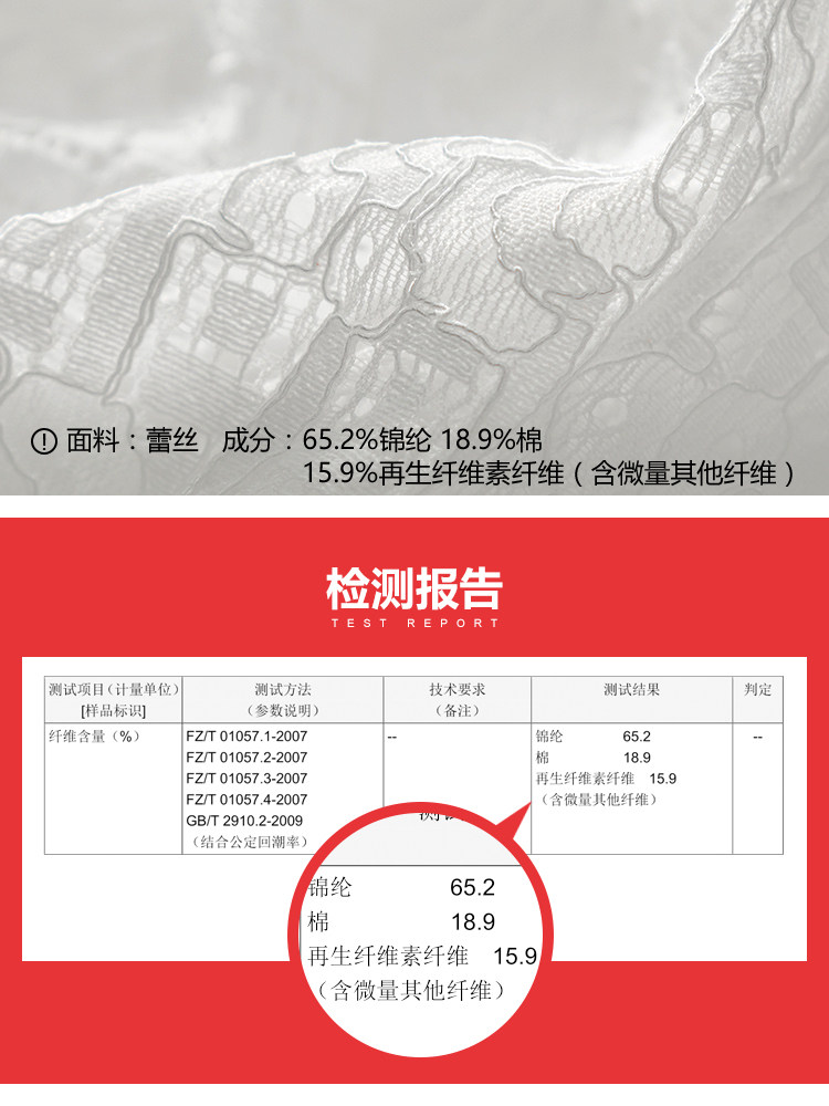 | 主 料:65.2%锦纶 18.9%棉 15.9%再生纤维素纤维(含微量其他纤维)颜 色:白色 |