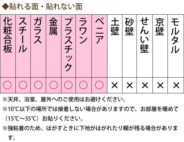 | 仕様 | 耐熱温度:60度 屋内貼り用 ●貼れる面 化粧合板、スチール、ガラス、金属、プラスチック、ラワン、べニア ●貼れない面 土壁、砂壁、せんい壁、京壁、モルタル |