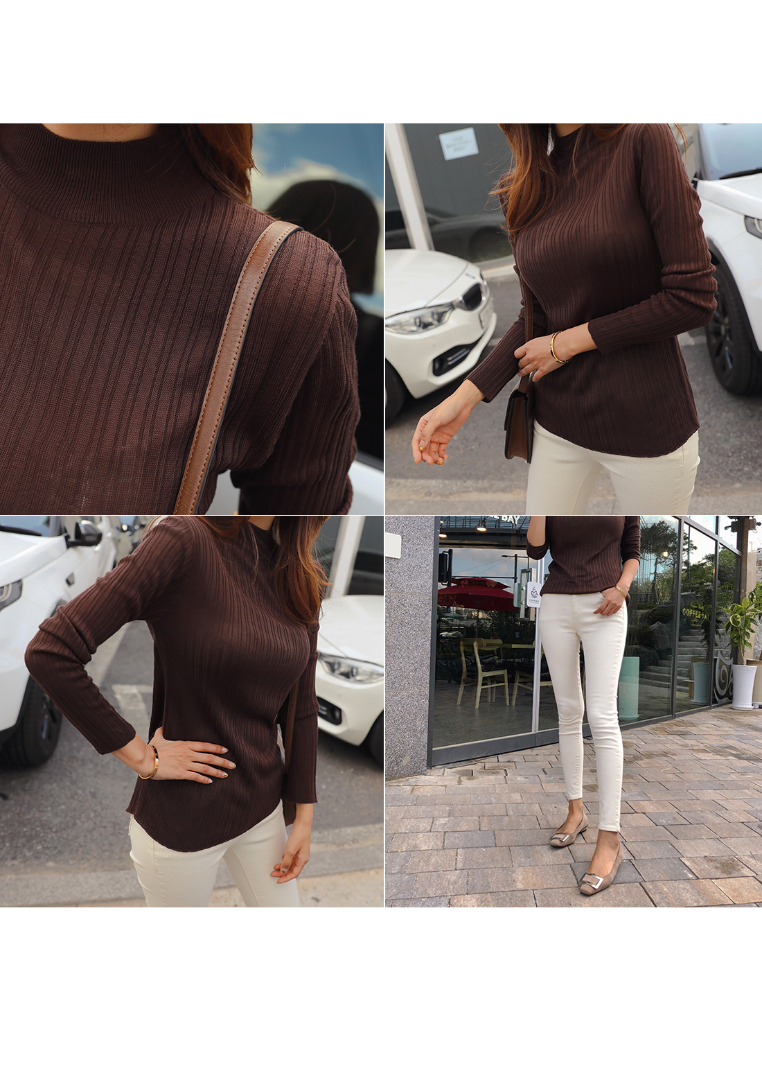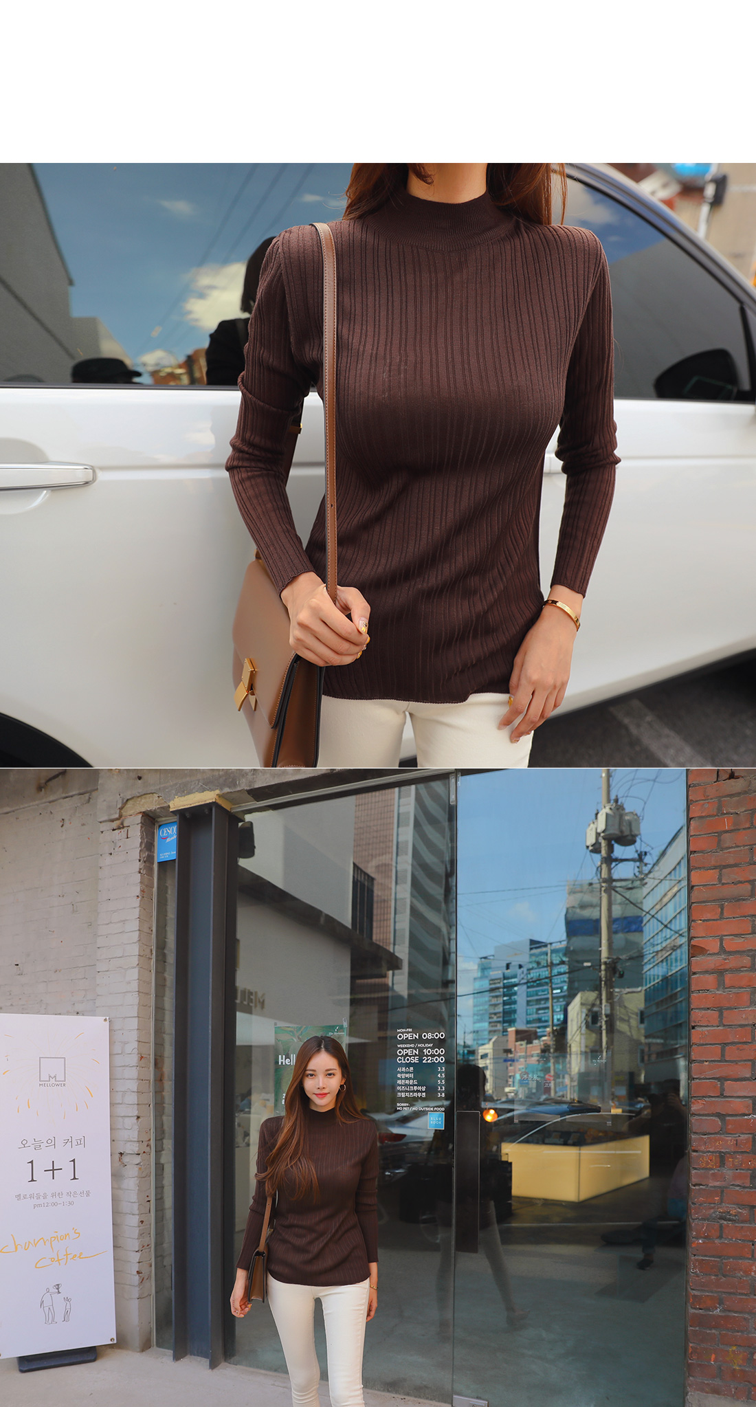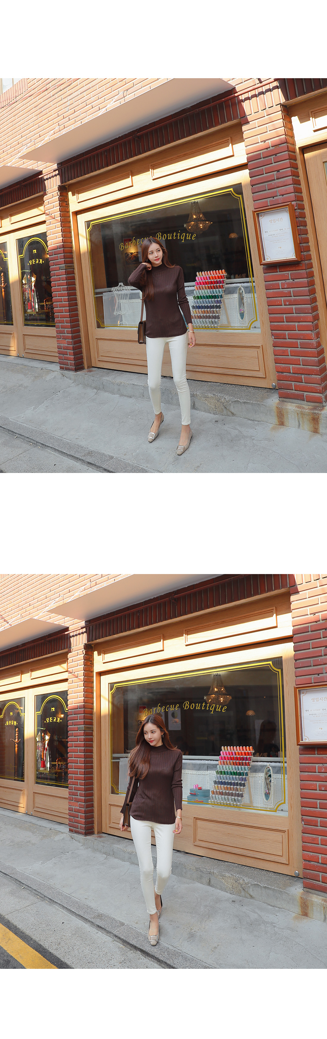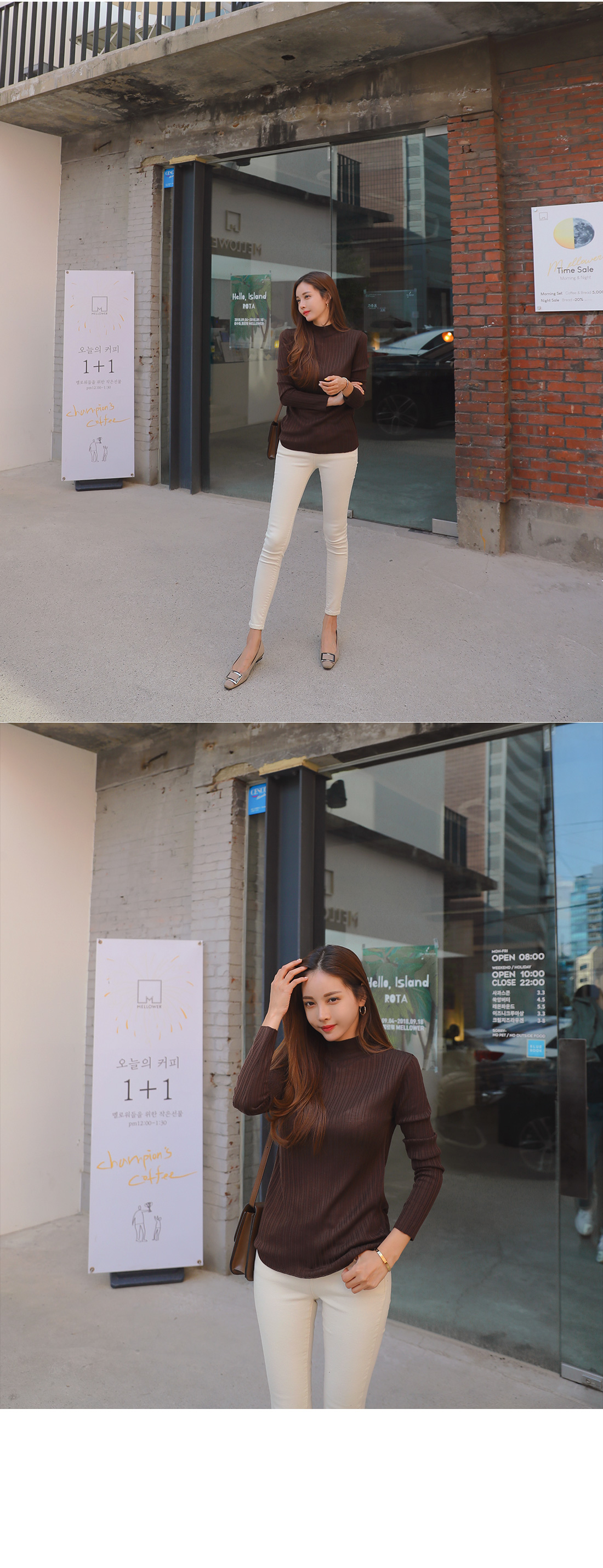 MD COMMENT 데일리하게 즐겨입기 좋은 니트를 소개할게요.반하이넥 디자인으로 안정감있는 착용감을 느낄 수 있는 아이템이구요.세로 골지 짜임으로 날씬해보이며 바디라인에 슬림하게 떨어지는 라인으로 너무 핏되지 않아 부담없이 즐겨입기 좋아요.전체적으로 신축성이 뛰어난 아크릴 혼방 소재로바디를 감싸주어 편안한 착용감을 선사해드려요.적당한 두께감의 니트 소재로 단독으로는 물론!FW시즌에 다양한 아우터 안에 이너로 레이어드하여두루두루 즐겨입기 좋은 추천할게요!7가지 다양한 컬러로 준비했으니 상세 페이지 참고 후 굿 초이스 해주세요:)COLOR/SIZE 브라운,네이비,카키,스카이블루,베이지,아이보리,블랙FREEMODEL FITTING 브라운/FREE