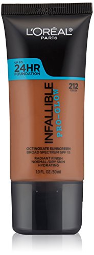 Discover the new pro finish of longwear: up to 24 hour wear with a hydrating glow. Lightweight and creamy, L’Oral Paris' Infallible Pro Glow Foundation is a long lasting foundation that goes on smooth with a glow finish that lasts. Hydrating foundation has medium coverage and instantly hides imperfections for a clear complexion. This luminous foundation with SPF is ideal for normal to dry skin. • Up to 24HR Foundation • Hydrating Glow, Medium Coverage • Healthy, Radiant Finish • The New Pro-Look of Longwear Apply to cheeks, forehead, and chin blending outward. Finish with Infallible Pro-Spray and Set for a lasting glow look. Octinoxate 3.01% Warnings. For external use only. Do not use on damaged or broken skin. When using this product keep out of eyes. Rinse with water to remove. Stop use and ask a doctor if rash occurs. Keep out of reach of children. If swallowed, get medical help or contact a Poison Control Center right away.Feature