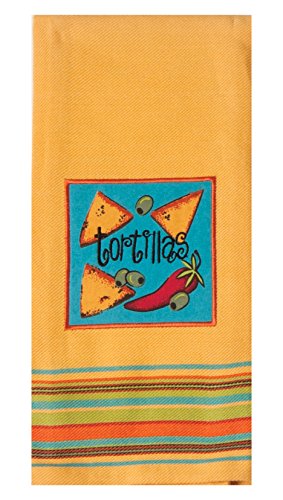 - Yellow tea towel features jalapenos and tortilla applique with embroidery detailing