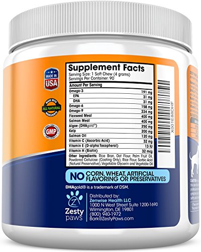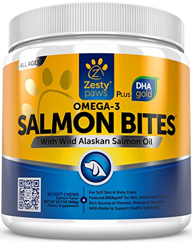 -. Feature : A HEALTHY TREAT DOGS LOVE - Zesty Paws Salmon Bites supplements are made with wild caught Alaskan Salmon Oil and Salmon Meal to provide Omega-3 and Omega-6 fatty acids (EPA and DHA) that help dogs of all ages, breeds, and sizes feel their best. / FEATURING DHAgold® - This powerful canine formula contains DHAgold®, an algae sourced DHA fatty acid that helps to nourish skin and coats, while also promoting brain and heart health to ensure that your dog gets the care he needs. / VITAMINS THAT DELIVER REAL RESULTS - These treats also contain Vitamin C for antioxidant support, while Biotin and Vitamin E work together to help with dry, itching, and irritated skin, while also giving coats a soft and healthy appearance. / HIP & JOINT CARE - As canines age, discomfort can occur in the hips and joints, which can lead to reduced movement and arthritis pain. The omegas in this natural supplement may support joint pain relief and flexibility. / A PET SUPPLEMENT YOU CAN TRUST - Zesty Paws understands how much your pet's wellness means to you, so they manufacture Salmon Bites in FDA-registered facilities that are NSF and GMP-certified in the USA.
