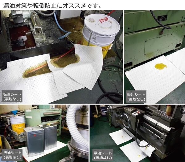 | 工場内の機械周りの漏油対策や床・通路などでの油による転倒防止にオススメの吸油性能抜群のシートです。エコノミータイプながら、抜群の吸油量と油保持力を可能にしました。水は吸わずに油だけを吸い取ります。 |