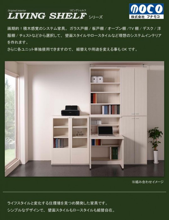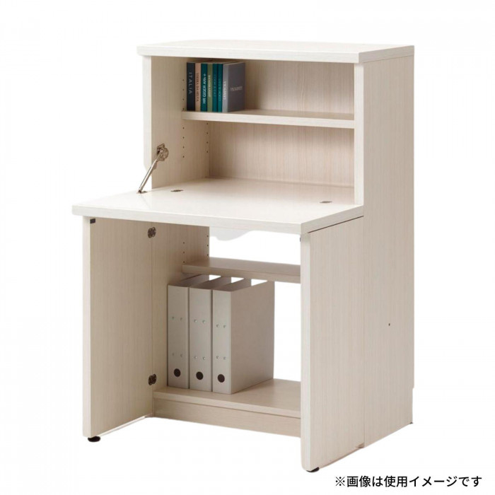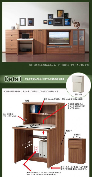 | 素材・材質 | 本体内外装:プリント化粧板 デスク天板:白ポリエステル化粧合板 その他天板、板戸前面:特殊プリント化粧板 固定金具:鋼材 連結金具:軟鋼材 取っ手:アルミ材 |