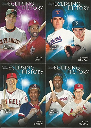 [Product Information]- This is the 2015 Topps Eclipsing History MLB Baseball Series Complete Mint 10 Card Dual Player Insert Set, it was never issued in factory form. Loaded with stars and Hall of Famers including Stan Musial, Hank Aaron, Sandy Koufax, Nolan Ryan, Ozzie Smith, Omar Vizquel, Tom Seaver, Dwight Gooden, Whitey Ford, Mariano Rivera, Rod Carew, Mike Trout, Jim Rice, Nomar Garciaparra, Derek Jeter, Lou Gehrig, Lou Brock, Rickey Henderson, Darryl Strawberry and David Wright.