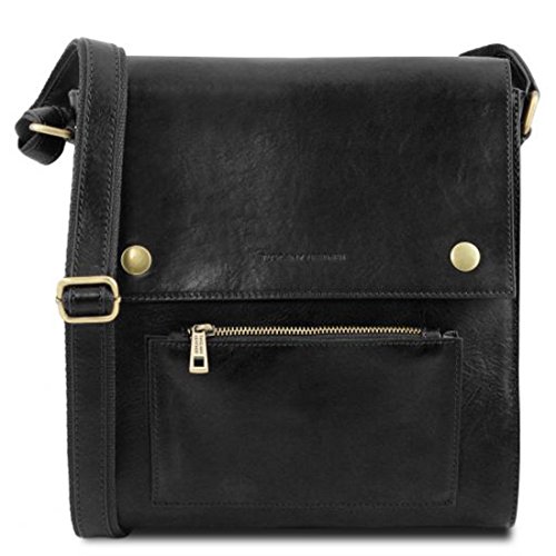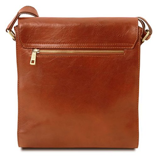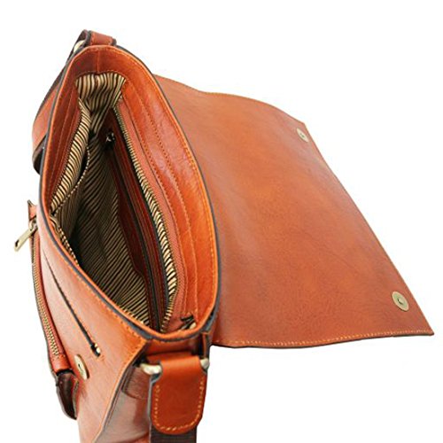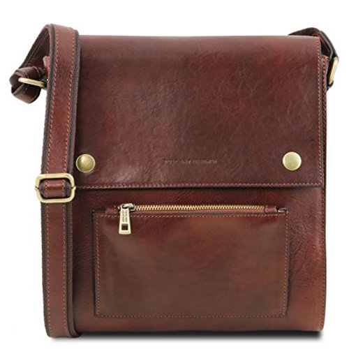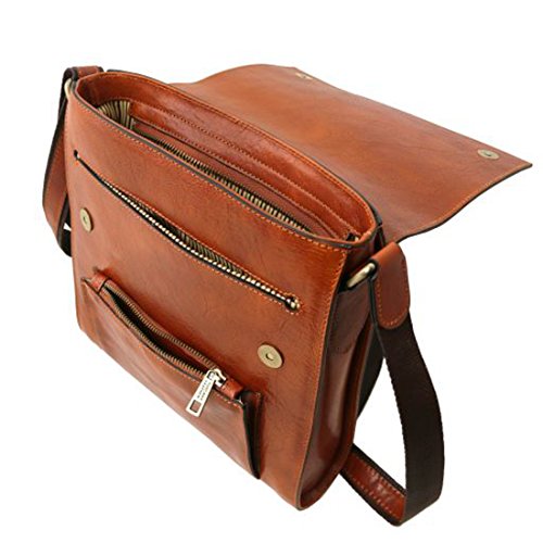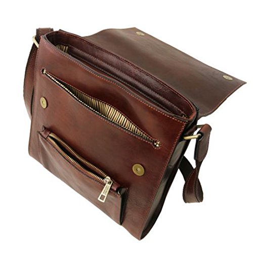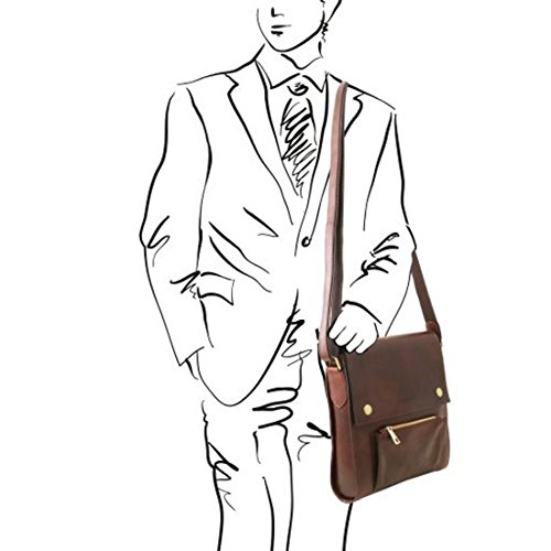Dimensions: 2.8 x 11 x 11.6 inches Weight: 2.18 Lbs Materials: Polished calf-skin leather Inside material: Cotton lining Outside part: Front pocket with zip closure Flap Open pocket on the front side Back compartment with YKK metal zip Semi-rigid structure Inside part: 1 compartment Inside zip pocket Two multi-function pockets Hardware: Antique brass hardware Closure: Magnetic buttons closure Shoulder strap: Adjustable strap Leather and cloth shoulder strap Dust Bag: Dust Bag included