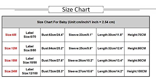 ★ NOTE: Attention plz: If your kid is chubby, we recomend choosing a larger size, Please compare the detail sizes with yours before you buy!Thanks. ★ Size Details (1 "= 2.54cm): ★ Size:6M Label Size:6/70 Bust:62cm/24.4" Sleeve:23cm/9.1" Length:30cm/11.8" Height:70CM ★ Size:12M Label Size:8/80 Bust:64cm/25.2" Sleeve:25cm/9.8" Length:32cm/12.6" Height:80CM ★ Size:18M Label Size:10/90 Bust:70cm/27.6" Sleeve:26cm/10.2" Length:34cm/13.4" Height:90CM ★ Size:24M Label Size:12/100 Bust:72cm/28.3" Sleeve:27cm/10.6" Length:36cm/14.2" Height:100CM ★★Guaranteer: ★If it is the quality question,we will resend or refund to you;If you receive damaged or wrong items,please contact me and attach some pictures about your product and packages to me,i will confirm it for you,if it really has some wrong,I will exchange a new correct item to you. ★If you are satisfied with our product or service,please leave your positive feedback! ----YANG YI ,Thanks so much. ★Please check the measurement chart carefully before you buy the item. Please note that slight color difference should be acceptable due to the light and screen. Please use cold water washing first time, and hand wash, to avoiding fades. 0