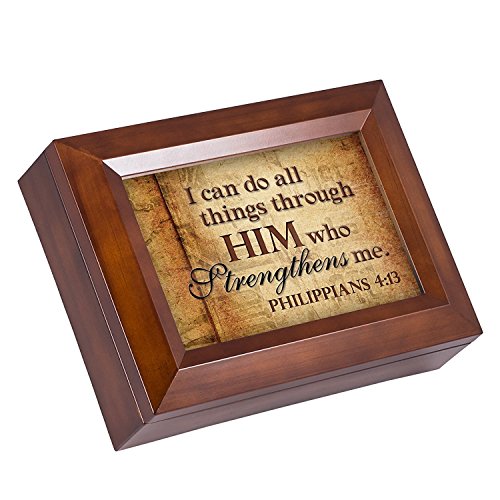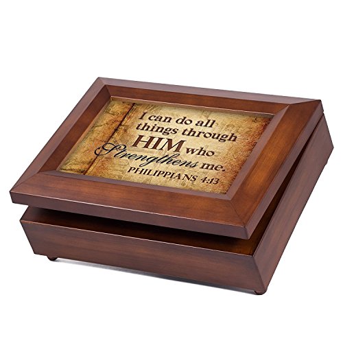 All Things Through Him Philipians 4:13 Wood Finish Jewelry Music Box Plays Waltz of the Flowers