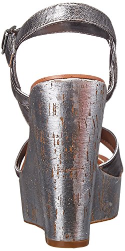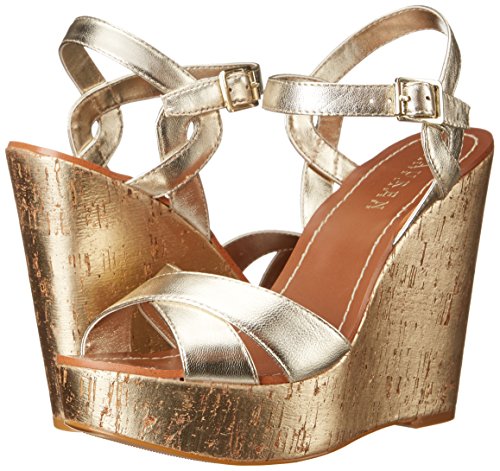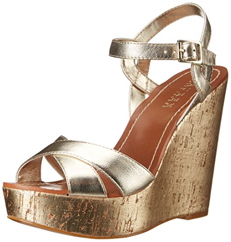 Wedge sandal with platform featuring distressed heel and crisscross straps over toe