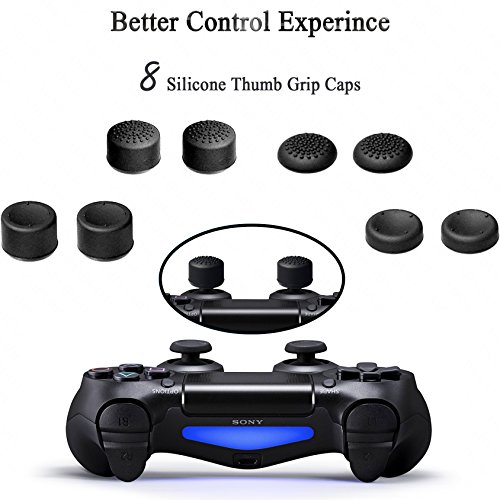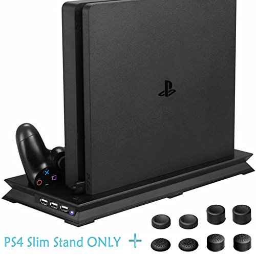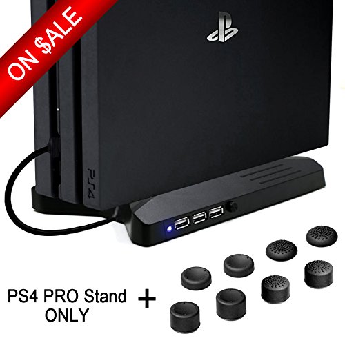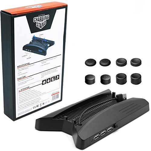 ALL-IN-ONE BASE - Multifunction as PS4 Pro console vertical stand + game console cooler dock + 3 USB hub for dualshock controller charging with 8 gamepad thumb grip caps.