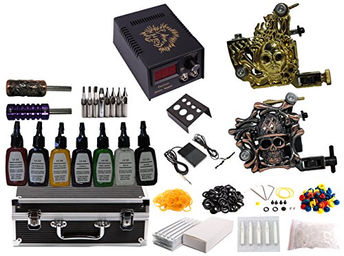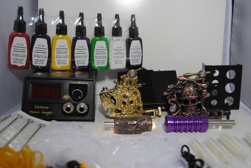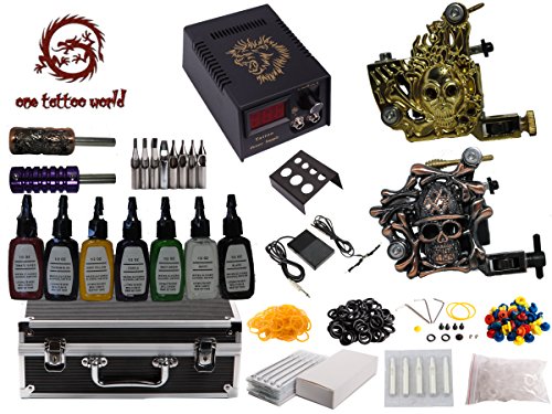 Studio : 1TattooWorld Publisher : 1TattooWorld Binding : Health and Beauty Product Description The Complete Tattoo Starter Kit OTW-KK02 is proudly offered by One Tattoo World ( http://www.amazon.com/shops/OneTattooworld ) the one stop shopping destination for tattoo beginners or professionals to purchase tattoo kits and supplies. Package Included: ?? 2 x Premium Handmade tattoo machine ?? 1 x High Quality Digital Power Supply ?? 7 x Color ink 1/5 oz (15ml) ?? 1 x Aluminum Grip ?? 1 x Stainless Steel Grip ?? 6 x Stainless steel tip ?? 20 x Disposable tip ?? 1 x Clip cord ?? 1 x Foot pedal ?? 1 x Power cord ?? 1 x Ink holder ?? 20 x Pre-sterilize tattoo needles(Various/Random in Size) ?? 100 x Ink cups ?? 1 x Adjust tool ?? 50 x O ring ?? 50 x Gromments ?? 50 x Rubber band ?? 1 x Aftercare ointment ?? 1 x Aluminium Alloy carrying case ?? 1 x CD Disk 0