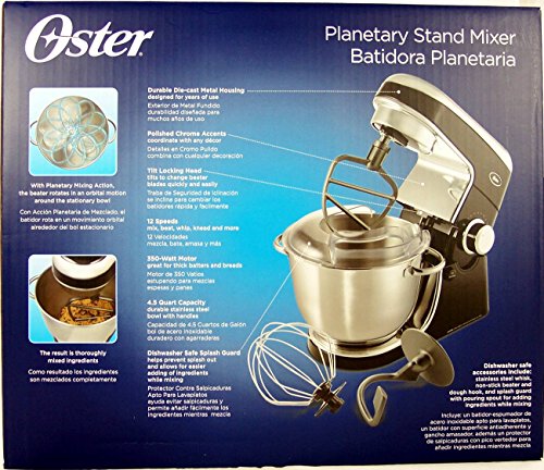 Power and performance take your culinary creativity to new heights. This stand mixer's unique planetary mixing action ensures ingredients are thoroughly mixed so you can prepare recipes with confidence and ease. Cake mixes, dough and cookie batters are easy as pie to mix up with 12 speeds providing versatility to mix a variety of foods with controlled, precise results. With the Oster® brand, you can cook with passion and serve with pleasure.Feature