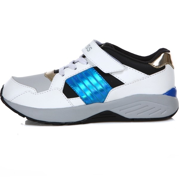 SI-18 트레이너의 아동버젼으로 아동의 선호도가 높은 컬러를 적용함. 갑피부분에 가죽을 사용하여 내구성을 높였으며 편리한 착화를 위해 밸크로 적용함