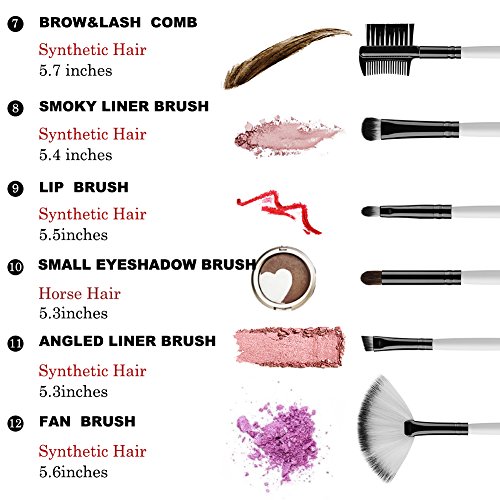 -FULL FUNCTIONAL: 12 pieces makeup brushes covering basic needs of all you makeup brushes: powder brush, blush brush, foundation brush, contour brush, fan brush, concealer brush, blush brush, eyeshadow brush, eyebrow brush, eye liner brush, eye lash brush and lip brush.