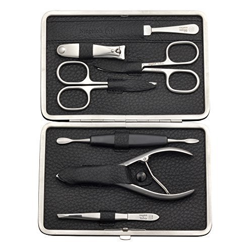 -. Title : Luxury Niegeloh German Made 7 Piece Luxury Brushed Stainless Steel Manicure Set in Soft Black Cowhide Case with Metal Frame by Niegeloh