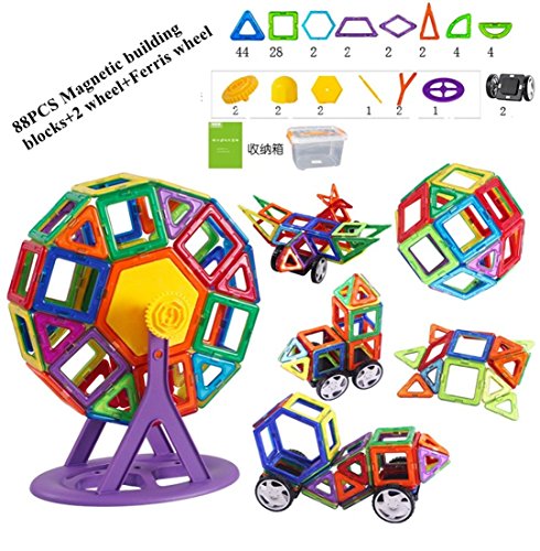 -. Feature : Strong magnets and safe ABS material.Harmless to human and environment, more durable. / The magnetic build blocks set contains 44 Triangles, 28 Squares, 2 Hexagons, 2 Trapezoids, 2 Rhombuses, 2 Isosceles Triangles, 4 Edge Semi-circles, 4 Semi-circles, Ferris Wheel parts, 2 wheels, instruction booklet and 1 carry box.Combine these shapes in any way, play a child's imagination, a great architect must be born! / Attractive colorful geometric shapes to help children acquire strong sense of color, fun and easy to build anything they would like! Good for kids physical and intellectual development. / A great creative toy that lets your child engage with their imagination. It's low-tech and creates very little noise. You child can develop their creative side and motor skills through play! / A educational toys can be played anywhere. Suitable for kids 3 years old and up.