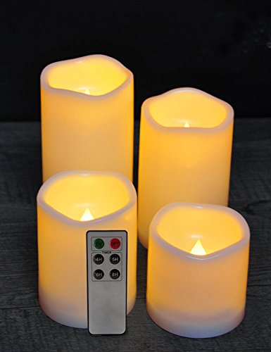 SET OF 4 WATERPROOF FLAMELESS CANDLES WITH REALISTIC AMBER FLICKER & REMOTE - The wavy edge candle has a slight amber flicker and flame sits inside the candle to give you a REAL LOOK & SERENE AMBIENCE - Unlike real wax ones, our IP44 waterproof lifelike candles can be placed anywhere even directly exposed to sunlight or harsh indoor lighting - Cluster candles together or scatter around room to set a cozy mood throughout - Comes with a remote control to set timer and work with all candles.