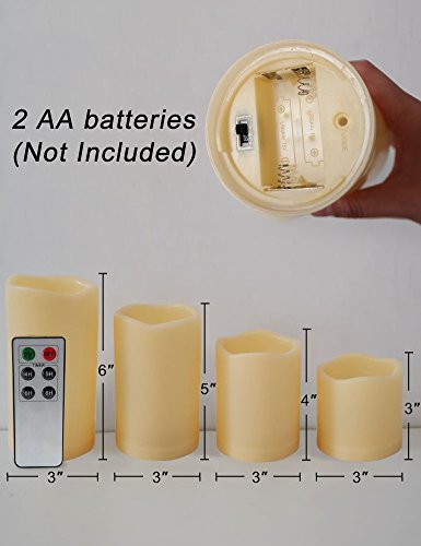6-KEY REMOTE CONTROL WITH 4/5/6/8 HOUR TIMER SETTINGS - For easy operation from comfort of your sofa or bed, you will also receive a remote control with range 18ft (5.5m) that operates all candles (same series) - Switch to "ON" to activate the candle, the timer function allows the candle to turn on for 4/5/6/8 hours and then remain off for 20/19/18/16 hours, casting subtle illumination at the same time as the previous day - Each candle requires two AA batteries (not included) for operation.