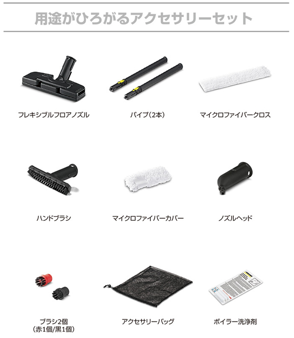 ●標準装備:フロアノズル、アクセサリーバッグ、RM 511 ボイラー洗浄剤、ノズルスタンド、ノズルヘッド、ハンドブラシ、ブラシ(黒)1 個 、ブラシ(赤)1 個、フロアノズル用クロス(マイクロファイバー)1 個、ハンドノズル用カバー(マイクロファイバー)1 個、延長パイプ(0.5m)2本