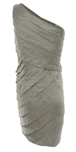 Product Description Dress features lined top, asymmetrical tiered sheen fabric, one shoulder silhouette, jeweled side detailing, and concealed side zipper with hook eye closure. 0