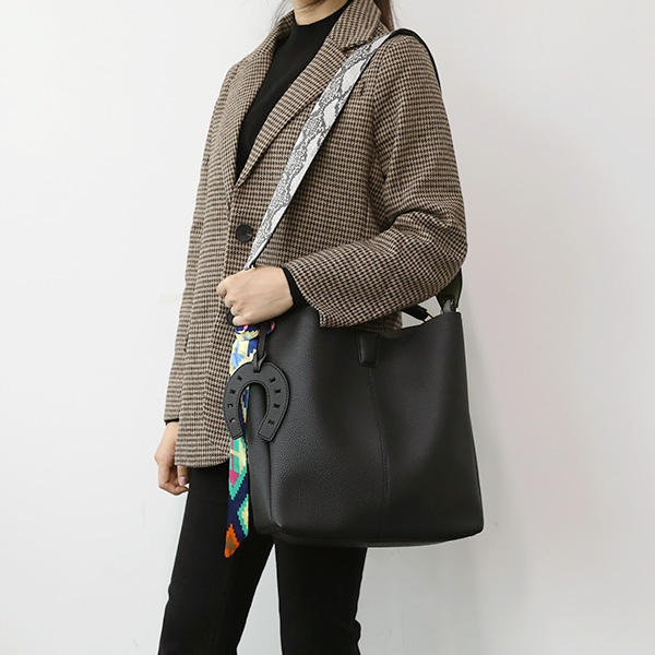 유연하면서도 두께감 있는 소재로 퀄리티가 높으며 어떤 룩에나 매치하기 좋은 심플한 디자인의 가방으로 스카프, 파우치가 함께 구성되어 있습니다. 가방에 달려있는 말굽 모양의 장식과 스카프가 심플한 스타일에 세련된 무드를 더해준답니다. 내부 공간이 넓어 다양한 소지품을 수납할 수 있으며 파우치는 별도로 사용하거나 가방 내부에 넣어 실용적인 분리 수납 공간으로 사용할 수 있어요. 내장된 스트랩의 한쪽 면에 뱀피 무늬가 들어가 더욱 유니크한 스타일로 즐길 수 있어요. 상세페이지 확인 후 굿초이스 해주세요! *모델 착용 컬러 - BLACK(블랙) / BROWN(브라운) / WINE(와인)           | COLOR | 블랙 / 그레이 / 베이지 / 브라운 / 와인 / 카키 | | 제품 색상은 모니터에 따라 실제 색상과 차이가 있을 수 있습니다. | | | | FABRIC | 합성가죽 | | | | PRODUCTION | 제조국 / 중국 | | 품질보증기준 / 소비자분쟁 해결기준에 따름 | | A/S 책임자 및 고객센터 / 감성가방 | | | | SIZE INFO | 사이즈는 측정 방법에 따라 1~2cm의 차이가 있을 수 있습니다. | | 스트랩 길이는 연결 고리를 제외한 길이이며, 최대 길이입니다. | | (단위:cm, g) | | 가로 길이 | 세로 길이 | 너비 | 손잡이 높이 | 스트랩 길이 | 무게 | | 32 | 30 | 12 | 11 | 뱀피스트랩-42(조절x)/일반스트랩-57(조절o) | 870 | |