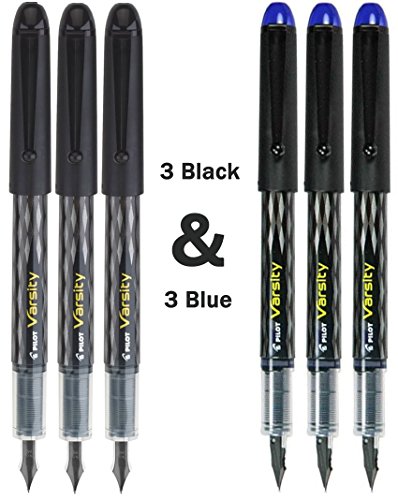 Pilot Varsity Disposable Fountain 6 Pack Combo, 3 Black Pens and 3 Blue Pens
