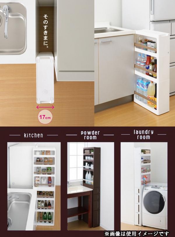 | キッチン、ランドリー、トイレ等のちょっとした隙間に便利な収納ラックです。別売りのドロアーやラックと積み重ねて使用することもできます。またキャスター付きで、ちょっとした移動にも便利です。 |