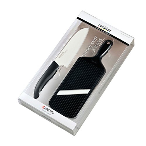 Kyocera Advanced Ceramic Revolution Series 5-1/2-inch Santoku Knife and Adjustable Slicer Set, Black