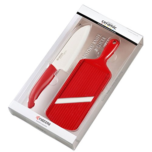 Kyocera Advanced Ceramic Revolution Series 5-1/2-inch Santoku Knife and Adjustable Slicer Set, Red