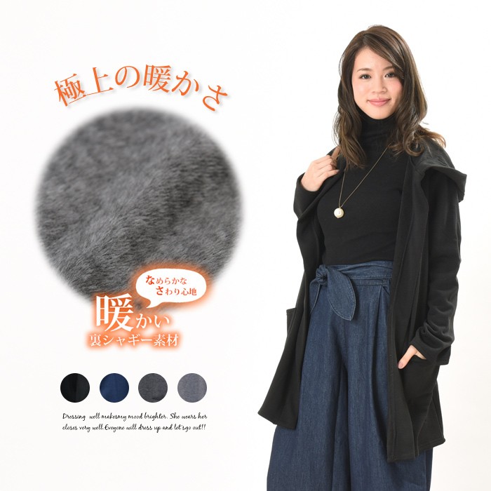 表面はふんわりとした触り心地、内側はシャギー素材でふんわりあったかい、これからの時期にピッタリのコーディガンです。オシャレな雰囲気がありシンプルなデザインなので、着回しがしやすくこなれ感があり幅広い年齢層の方に大人気です♪シンプルな雰囲気なので、コーディネートに取り入れやすくワードローブにお使いいただけます。フード付きでカジュアルな雰囲気もあるので、幅広いコーディネートに合わせやすいです。