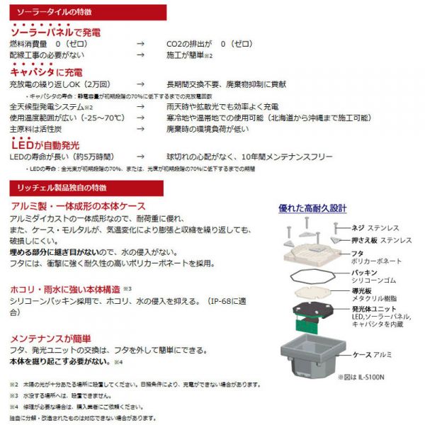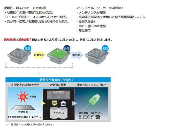 ●<リッチェル ソーラー共通特徴>①メンテナンスが簡単②高効率太陽電池を使用した全天候型発電システム③高耐久性設計④雨水に強い防水仕様⑤簡単施工