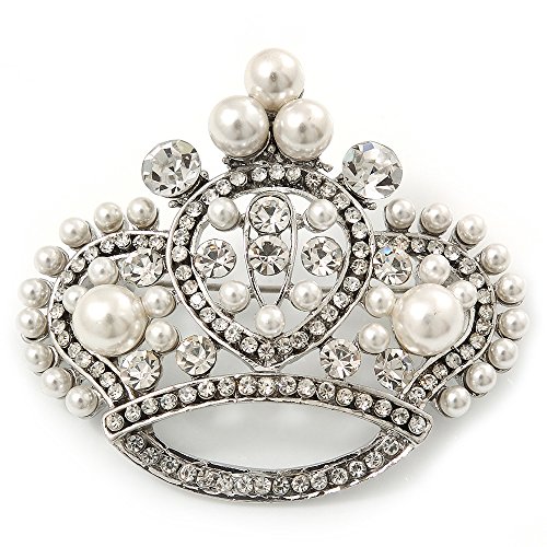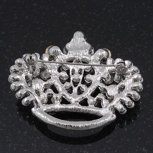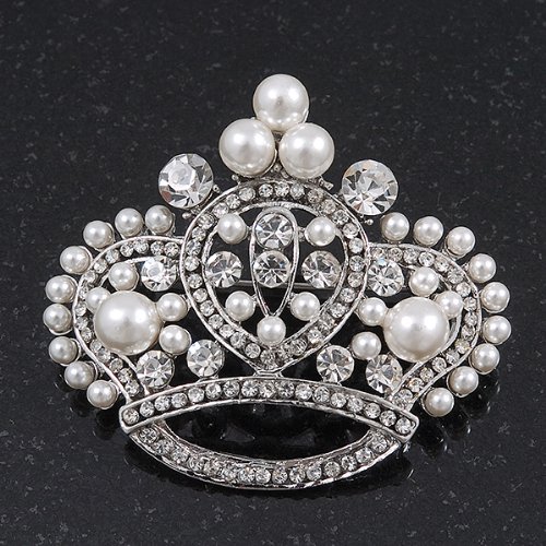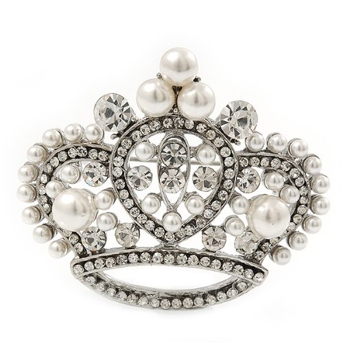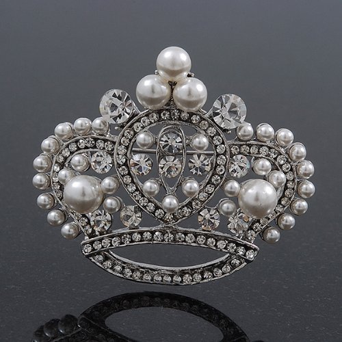 Whether you're the queen or the princess, you'll smile each time you see your sparkling brooch. Featuring a crown design, crafted in rhodium plated metal and decorated with white coloured faux pearls and clear and AB crystals for a dazzling look. Use it to craft a look that's all your own. The brooch measures about 5cm x 4.5cm and fastens with a flag pin and revolver clasp. This product does not contain any natural pearls.Feature
