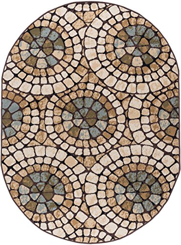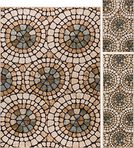 This transitional design is an exquisite mosaic with a Mediterranean flair. A timeless classic that will bring a casual look with designer style. In shades of blue, beige, gold and ivory. This area rug is available in several individual sizes and as a three piece set so you can harmonize your theme throughout your home. It is easy to care for, vacuum regularly to maintain its appearance. Spot clean as needed with mild detergent, do not dry clean or bleach.Feature