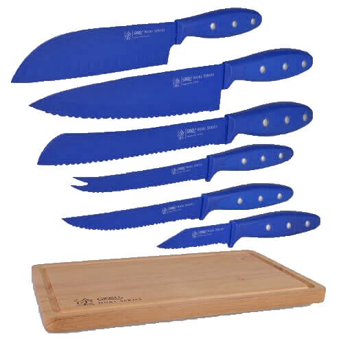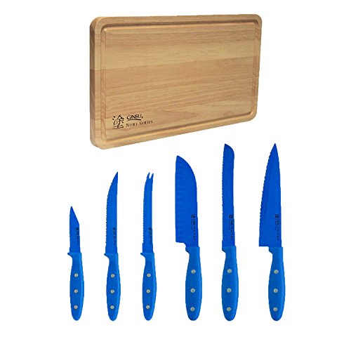Ginsu Nuri Series Stainless Steel 6-Piece Nonstick Coated Cutlery with Bonus Cutting Board - Blue