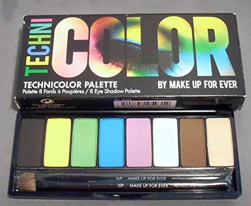 -. Feature : Make Up For Ever Technicolor Palette / 8 eye colors in bright tones and neutrals / Shades: 04, Jaune, 91, 72, 116, 00, 17 and 126 (black, yellow, apple green, turquoise, lilac, white, espresso and yellow beige) / Net weight each: 1 g / 0.03 oz. each / Includes 2 small eyeshadow applicator brushes in 10P and 16P