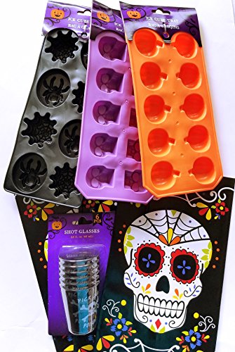 Halloween Party Drink Supplies with Silicone Ice Cube Trays, Drink/Shot Glasses and Sugar Skull Treat Bags