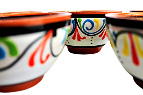 This beautiful set of bowls is ideal for salsas, sauces or small portions of food. The colors are vibrant, the shape stores and stacks easily and the hand painted terracotta is durable. The salsa bowls are wonderful for entertaining or everyday use. Please note, that since each bowl is hand crafted and hand painted, there will be small imperfections that make each piece unique and special. Cactus Canyon Ceramics also offers a smaller condiment bowl, and also a larger breakfast bowl.Feature