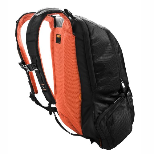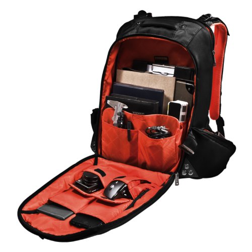 -. Feature : Dedicated ultra-soft padded laptop compartment accommodates up to 18" laptops / Gaming console sleeve included (suitable for Xbox 360, PS3, Wii, etc) / Clever buckle system allows for both partial or full 180 degree opening of the main compartment for easy loading / Hip pockets for quick access to items like keys, media players, and mobile phone without taking the bag off your back / Dual hand-carry handles for easy lifting / 5-point balance strap system evenly distributes weight for comfortable carrying / Water-resistant weather cover protects against dust, rain, or snow / Laptop Compartment: 1.38"x14.17"x19.69"