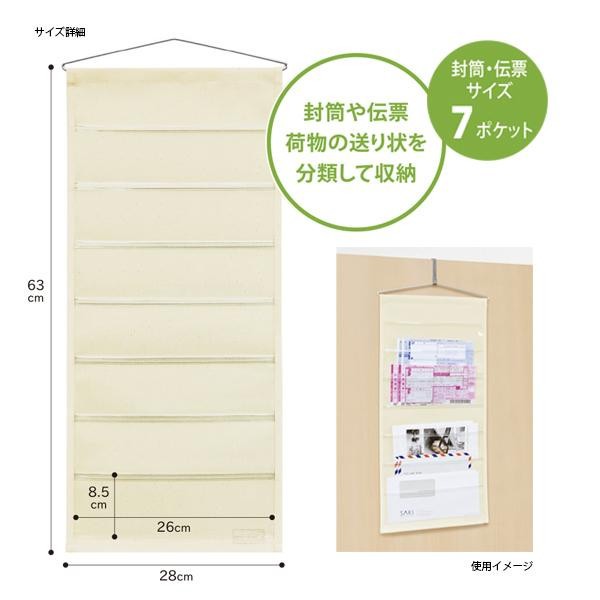 fk094igrjs封筒や伝票、荷物の送り状などを分類して収納できるウォールポケットです サイズ W28×H63cm(ポケットマチなし) 個装サイズ:29×25×5cm 重量 個装重量:200g 素材・材質 11号帆布(綿100%)、PVC(塩ビ)、アルミハンガー 仕様 耐荷重:1kg 製造国 日本 「封筒・伝票・書類」が仕分けできるウォールポケット ※モニターの設定などにより、実際の商品と色味や素材の見え方が異なる場合がございますあらかじめご了承ください 封筒や伝票、荷物の送り状などを分類して収納できるウォールポケットです