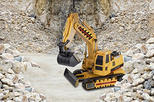 Simulated digging and work sounds (with mute button). Command-Center-Style Radio Control with joystick imitates real excavator controls.
