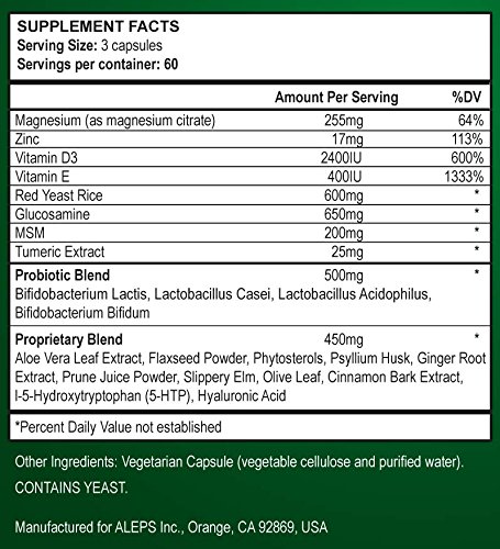 - Feature : Cleansing, Nourishing, Ongoing Pain Relief, Heart Health Support & More! / Over 20 Highly Effective and Often Costly Vitamins & Supplements in 1 Product / Magnesium (as magnesium citrate), Zinc, Vitamin D3, Vitamin E, Red Yeast Rice, Glucosamine, MSM, Tumeric Extract / Probiotic Blend: Bifidobacterium Lactis, Lactobacillus Casei, Lactobacillus Acidophilus, Bifidobacterium Bifidum / Proprietary Blend: Aloe Vera Leaf Extract, Flaxseed Powder, Phytosterols, Psyllium Husk, Ginger Root Extract, Prune Juice Powder, Slippery Elm, Olive Leaf, Cinnamon Bark Extract, l-5-Hydroxytryptophan (5-HTP) & Hyaluronic Acid